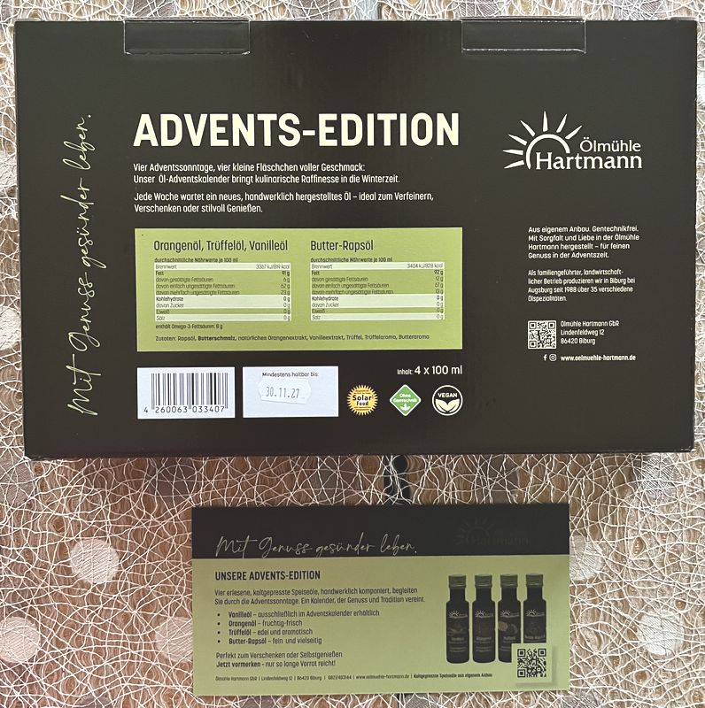 Hier ist mir in erster Linie die sogenannte Advents-Edition ins Auge gefallen. Dabei handelt es sich um einen limitierten Öl-Adventskalender, mit je 4 Flaschen unterschiedlicher, kaltgepresster Premium-Öle – für jeden Adventssonntag eine neue kulinarische Sorte. Diese finden nicht nur in der Adventszeit für leckere Backrezepte Verwendung, sondern auch für tolle Wildgerichte, Pastagerichte und vielerlei mehr. Und das Beste ist, man bekommt vier passende Rezepte gratis dazu. Eine echt einzigartige Geschenkidee als Alternative zu einem sonst üblichen Adventskalender wie ich finde – und das gerade mal für 24,99 €.