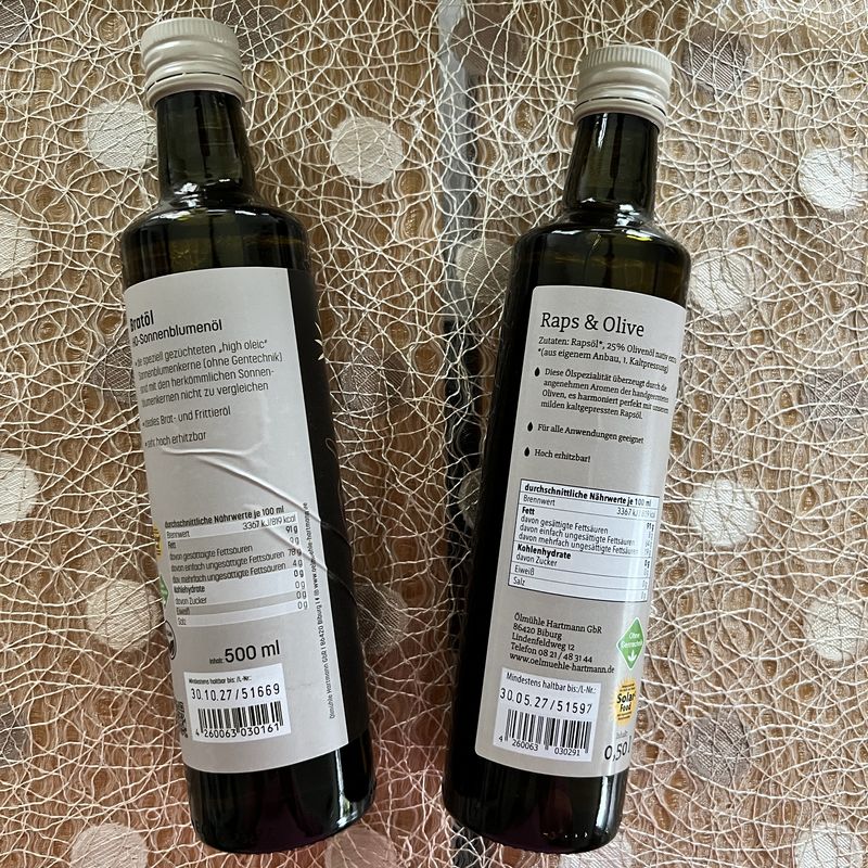 Man bekommt allerdings auch eine immense Auswahl verschiedener Ölsorten, die in  größeren Flaschen, also mit mehr Inhalt, angeboten werden, so wie bspw. das Bratöl und die Sorte Raps & Olive.