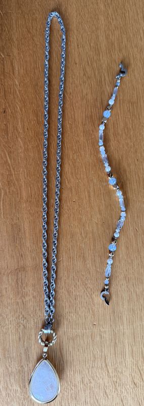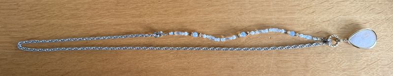 Bedingt dadurch kann man die unterschiedlichsten Schmuckstücke kreieren – so wie bspw. dieser Materialmix, bei meiner Halskette ESTHER. Der tropfenförmige Anhänger ist goldfarben und hat einen etwas größeren, ebenfalls goldfarbenen Ring, woran die Kette geclipt ist. Die Kette wiederum besteht aus zwei verschiedenen, aneinander geclipten Schmuckstücken – zum einen eine silberfarbene, geflochtene Kette und daran ist noch ein kleines Perlenband, mit pastellblauen, weißen und transparenten Steinchen befestigt.
