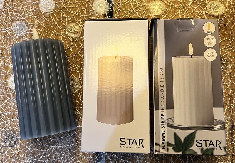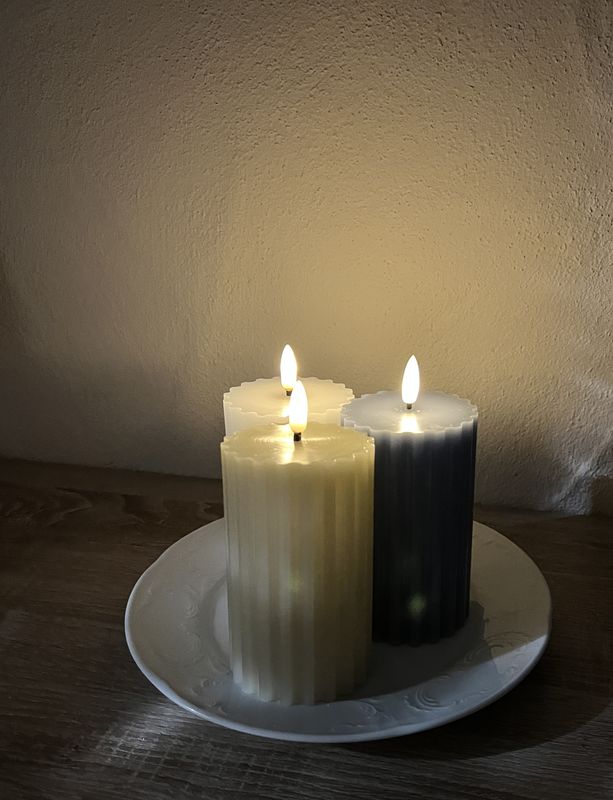 Auch diese sind mit einem natürlichen Flackereffekt sowie mit der praktischen Timerfunktion ausgestattet. Es gibt diese Kerzen in 4 unterschiedlichen Farben und ich ärgere mich ein wenig, dass ich lediglich die Farben blau, weiß und beige gewählt habe, denn grün ist mittlerweile leider ausverkauft. Ansonsten hätte man auch wunderbar eine tolle Adventsdeko damit zusammenstellen können. Mit solchen LED Kerzen muss man keine Angst mehr haben, dass vielleicht die Tannenzweige anfangen zu kokeln oder dass sich Ruß an der Decke, oder an der Tapete absetzt. Dadurch, dass sie aus Echtwachs und mit flackernder Flammen-Optik ausgestattet sind, sieht es mindestens genauso schön aus und ist wesentlich wenig gefährlich.