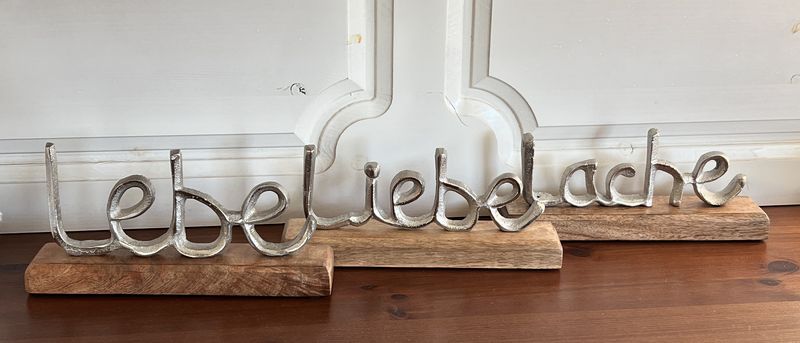Im Innern ist sie gefüllt mit rotem Wasser und gelbem Wachs. Schaltet man die Leuchte an, dann erwärmt die Glühlampe am Sockel nach einiger Zeit das Wachs, das automatisch als Blase, oder in Tropfenform nach oben aufsteigt. An der Oberfläche kühlt das Wachs dann ab und sinkt wieder nach unten. Durch diesen Effekt entsteht ein wunderschönes Lichtspiel, dem man stundenlang zuschauen könnte. So eine Lampe ist nicht nur eine tolle Deko, sondern auch prima als Geschenkidee geeignet – so wie jetzt gerade passend zur Weihnachtszeit. Und wenn wir schon mal bei Weihnachtsgeschenken sind, dann zeige ich euch auch noch diese dekorativen 3-teiligen Aufsteller aus einer Metall-Holz-Kombination, mit den motivierenden und erheiternden Worten „Lebe Liebe Lache“. Sie passen zu jedem Einrichtungsstil und sind eine wunderbare Geschenkidee in jeder Lebenslage.