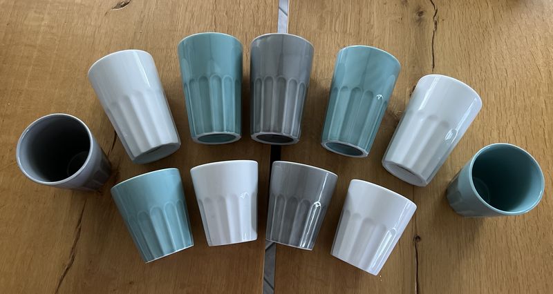 Es gibt die Becher in zwei unterschiedlichen Größen. Zum einen als Cappuccinobecher, mit 250 ml Inhalt – und zum anderen als Latte Macchiato Becher, mit einem Volumen von 400 ml Inhalt. Insgesamt kann man aus drei unterschiedlichen Farben wählen – weiß, grau, oder türkisblau. Da ich es eher nicht so eintönig, sondern viel lieber farbenfroh mag, habe ich die Farben alle miteinander kombiniert, was zusammen eine super schöne Farbkombination ergibt.