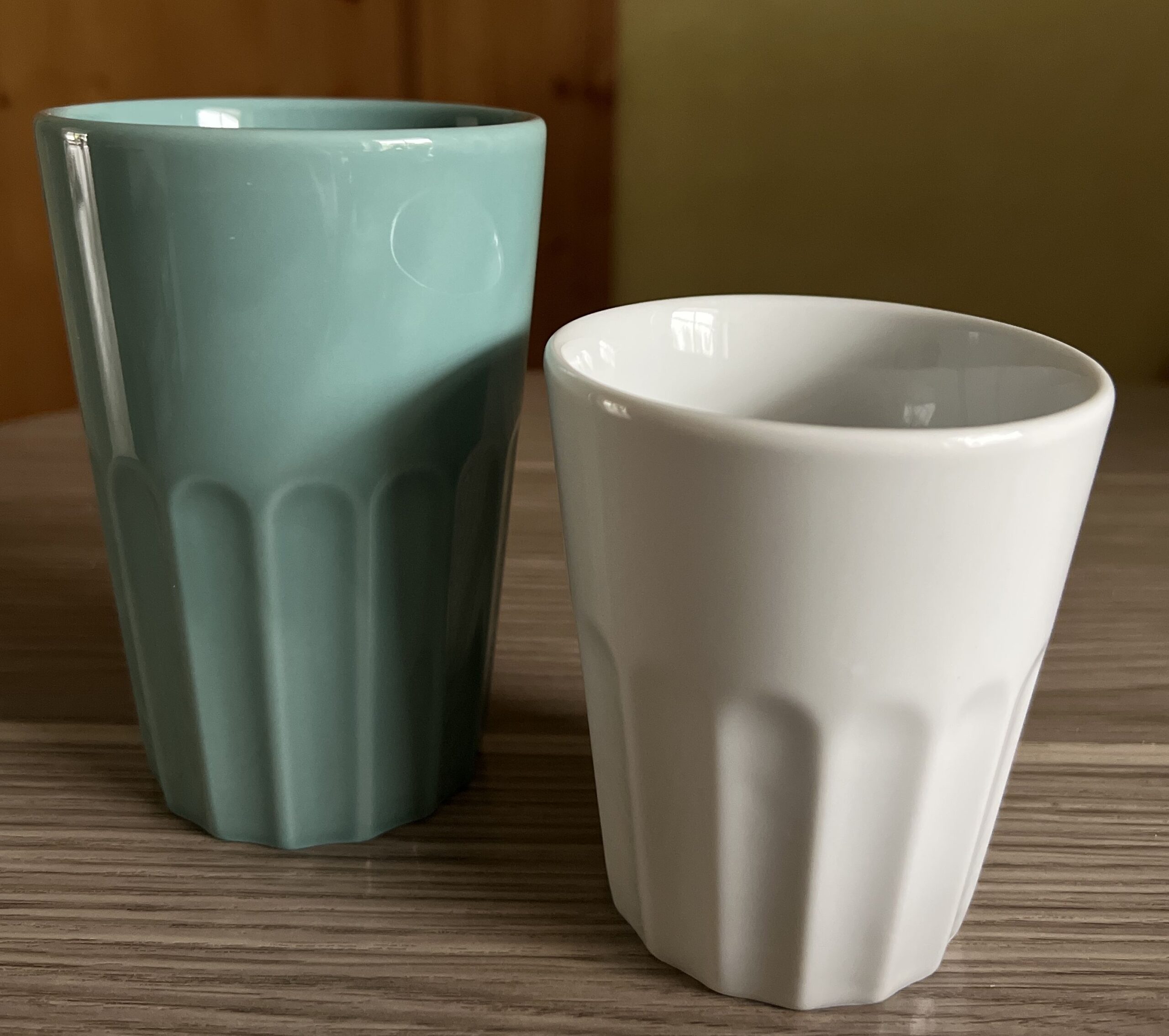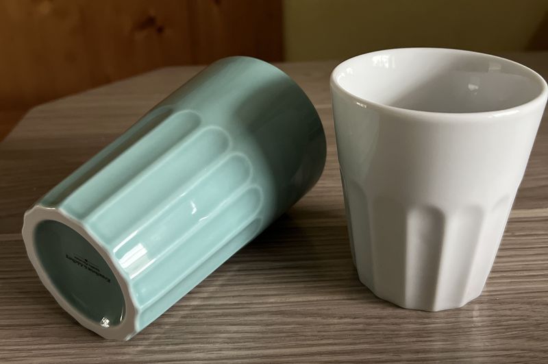 Optisch ist das Design richtig schön anzusehen und durch die geschwungenen Strukturen sind die Becher auch sehr griffig. Das Porzellan ist dick und robust und kann problemlos in der Spülmaschine gereinigt werden. Im Übrigen sind die Tassen auch für die Mikrowelle geeignet, so dass man darin – bis 600 Watt – bspw. prima Milch erwärmen kann.