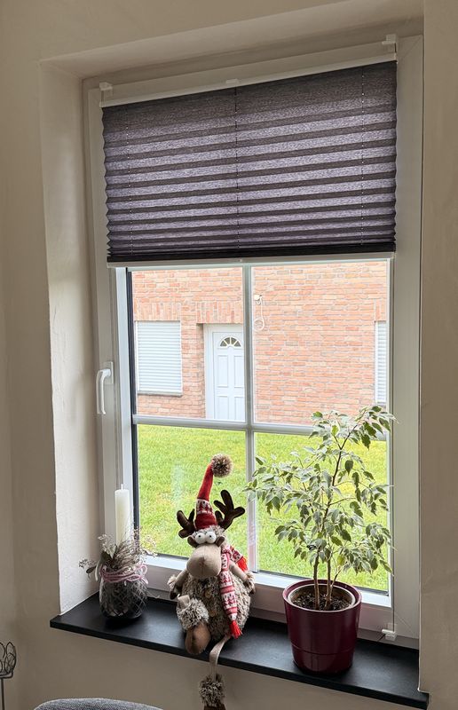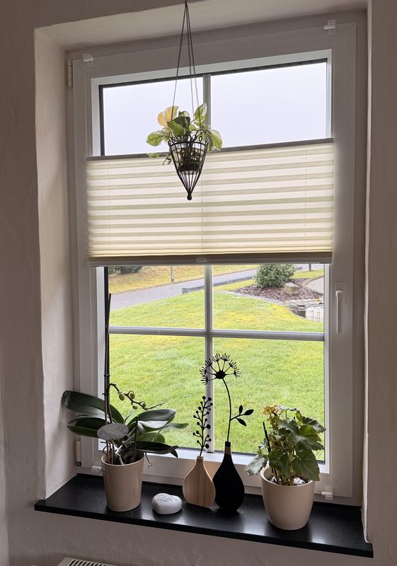 Unsere Auswahl für den Erker ist auf Plissees ohne Bohren der Dolomite-Kollektion gefallen. Für zwei Fenster haben wir die Farbe „Vanilla Sky“ und für das dritte Fenster die Farbe „Dark Vintage“ gewählt – also mal etwas ganz anderes.